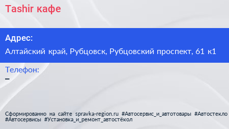Tashir, кафе по адресу Алтайский край, Рубцовск, Рубцовский проспект, 61 к1 в дальнейшем Организация, размещена в следующих категориях: