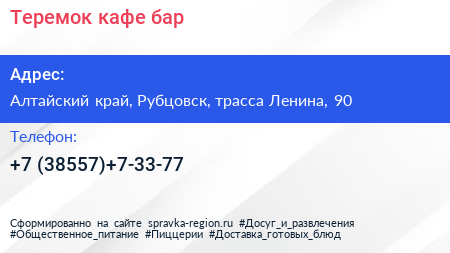 Теремок, кафе-бар по адресу Алтайский край, Рубцовск, трасса Ленина, 90 в дальнейшем Организация, размещена в следующих категориях:
