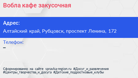 Вобла, кафе-закусочная по адресу Алтайский край, Рубцовск, проспект Ленина, 172 в дальнейшем Организация, размещена в следующих категориях: