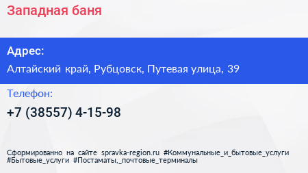 Западная, баня по адресу Алтайский край, Рубцовск, Путевая улица, 39 в дальнейшем Организация, размещена в следующих категориях: