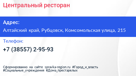 Центральный, ресторан по адресу Алтайский край, Рубцовск, Комсомольская улица, 215 в дальнейшем Организация, размещена в следующих категориях: