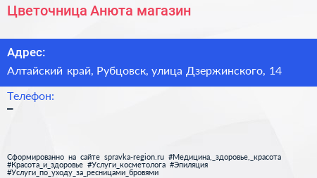 Цветочница Анюта, магазин по адресу Алтайский край, Рубцовск, улица Дзержинского, 14 в дальнейшем Организация, размещена в следующих категориях:
