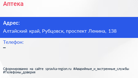 Аптека по адресу Алтайский край, Рубцовск, проспект Ленина, 138 в дальнейшем Организация, размещена в следующих категориях: