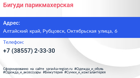 Бигуди, парикмахерская по адресу Алтайский край, Рубцовск, Октябрьская улица, 6 в дальнейшем Организация, размещена в следующих категориях: