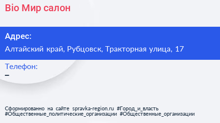 Bio Мир, салон по адресу Алтайский край, Рубцовск, Тракторная улица, 17 в дальнейшем Организация, размещена в следующих категориях:
