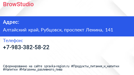 BrowStudio по адресу Алтайский край, Рубцовск, проспект Ленина, 141 в дальнейшем Организация, размещена в следующих категориях: