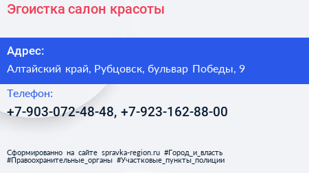 Эгоистка, салон красоты по адресу Алтайский край, Рубцовск, бульвар Победы, 9 в дальнейшем Организация, размещена в следующих категориях: