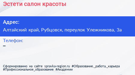 Эстети, салон красоты по адресу Алтайский край, Рубцовск, переулок Улежникова, 3а в дальнейшем Организация, размещена в следующих категориях: