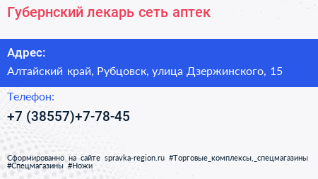 Губернский лекарь, сеть аптек по адресу Алтайский край, Рубцовск, улица Дзержинского, 15 в дальнейшем Организация, размещена в следующих категориях: