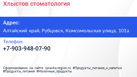 Хлыстов, стоматология по адресу Алтайский край, Рубцовск, Комсомольская улица, 101а в дальнейшем Организация, размещена в следующих категориях:
