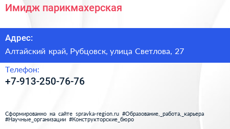 Имидж, парикмахерская по адресу Алтайский край, Рубцовск, улица Светлова, 27 в дальнейшем Организация, размещена в следующих категориях: