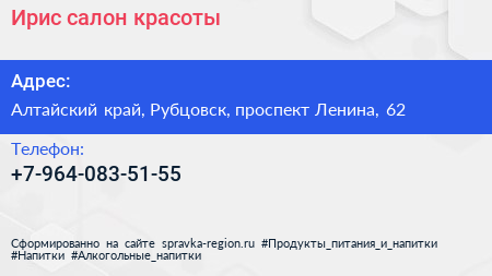 Ирис, салон красоты по адресу Алтайский край, Рубцовск, проспект Ленина, 62 в дальнейшем Организация, размещена в следующих категориях: