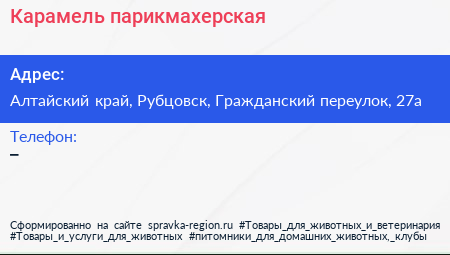 Карамель, парикмахерская по адресу Алтайский край, Рубцовск, Гражданский переулок, 27а в дальнейшем Организация, размещена в следующих категориях: