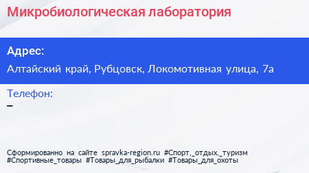 Микробиологическая лаборатория по адресу Алтайский край, Рубцовск, Локомотивная улица, 7а в дальнейшем Организация, размещена в следующих категориях: