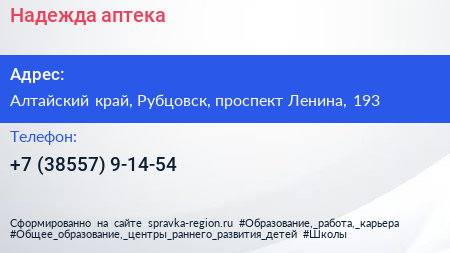 Надежда, аптека по адресу Алтайский край, Рубцовск, проспект Ленина, 193 в дальнейшем Организация, размещена в следующих категориях:
