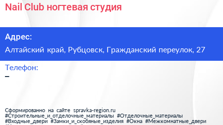 Nail Club, ногтевая студия по адресу Алтайский край, Рубцовск, Гражданский переулок, 27 в дальнейшем Организация, размещена в следующих категориях: