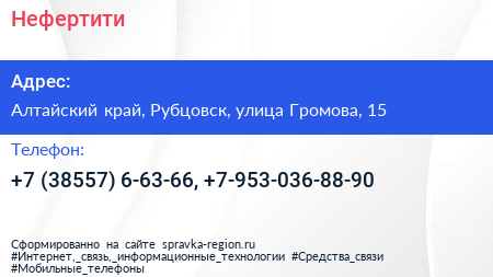 Нефертити по адресу Алтайский край, Рубцовск, улица Громова, 15 в дальнейшем Организация, размещена в следующих категориях: