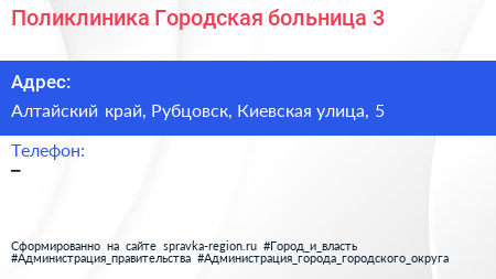 Поликлиника, Городская больница №3 по адресу Алтайский край, Рубцовск, Киевская улица, 5 в дальнейшем Организация, размещена в следующих категориях: