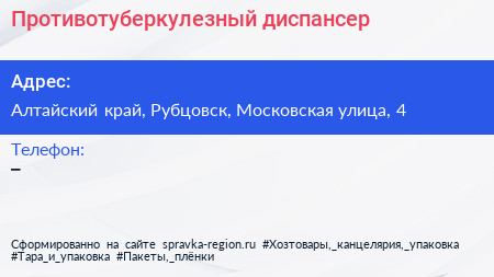 Противотуберкулезный диспансер по адресу Алтайский край, Рубцовск, Московская улица, 4 в дальнейшем Организация, размещена в следующих категориях: