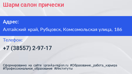 Шарм, салон прически по адресу Алтайский край, Рубцовск, Комсомольская улица, 186 в дальнейшем Организация, размещена в следующих категориях: