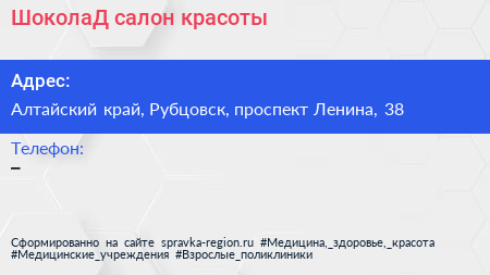 ШоколаД, салон красоты по адресу Алтайский край, Рубцовск, проспект Ленина, 38 в дальнейшем Организация, размещена в следующих категориях: