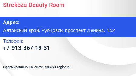 Strekoza Beauty Room по адресу Алтайский край, Рубцовск, проспект Ленина, 162 в дальнейшем Организация, размещена в следующих категориях: