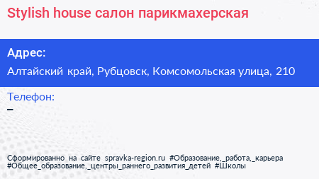 Stylish house, салон-парикмахерская по адресу Алтайский край, Рубцовск, Комсомольская улица, 210 в дальнейшем Организация, размещена в следующих категориях: