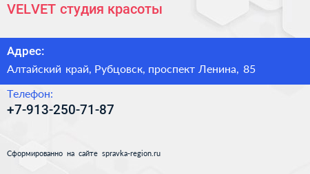 VELVET, студия красоты по адресу Алтайский край, Рубцовск, проспект Ленина, 85 в дальнейшем Организация, размещена в следующих категориях: