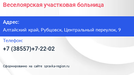 Веселоярская участковая больница по адресу Алтайский край, Рубцовск, Центральный переулок, 9 в дальнейшем Организация, размещена в следующих категориях: