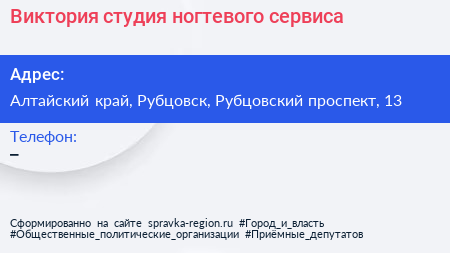 Виктория, студия ногтевого сервиса по адресу Алтайский край, Рубцовск, Рубцовский проспект, 13 в дальнейшем Организация, размещена в следующих категориях: