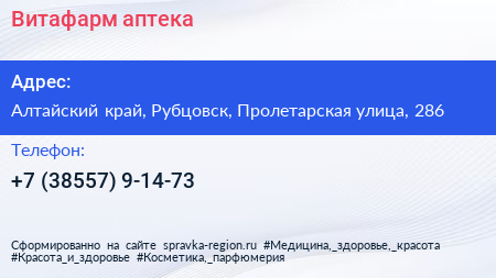 Витафарм, аптека по адресу Алтайский край, Рубцовск, Пролетарская улица, 286 в дальнейшем Организация, размещена в следующих категориях: