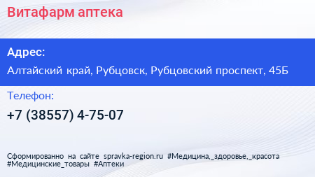 Витафарм, аптека по адресу Алтайский край, Рубцовск, Рубцовский проспект, 45Б в дальнейшем Организация, размещена в следующих категориях: