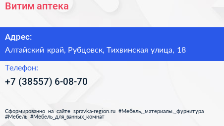 Витим, аптека по адресу Алтайский край, Рубцовск, Тихвинская улица, 18 в дальнейшем Организация, размещена в следующих категориях:
