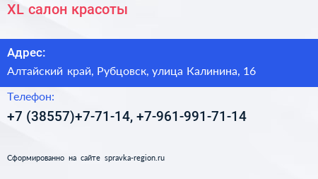 XL, салон красоты по адресу Алтайский край, Рубцовск, улица Калинина, 16 в дальнейшем Организация, размещена в следующих категориях: