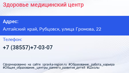 Здоровье, медицинский центр по адресу Алтайский край, Рубцовск, улица Громова, 22 в дальнейшем Организация, размещена в следующих категориях: