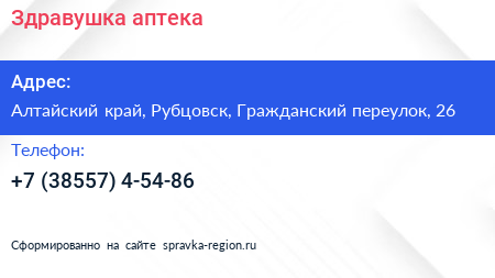 Здравушка, аптека по адресу Алтайский край, Рубцовск, Гражданский переулок, 26 в дальнейшем Организация, размещена в следующих категориях: