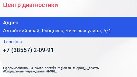Центр диагностики по адресу Алтайский край, Рубцовск, Киевская улица, 5/1 в дальнейшем Организация, размещена в следующих категориях: