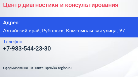 Центр диагностики и консультирования по адресу Алтайский край, Рубцовск, Комсомольская улица, 97 в дальнейшем Организация, размещена в следующих категориях: