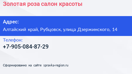 Золотая роза, салон красоты по адресу Алтайский край, Рубцовск, улица Дзержинского, 14 в дальнейшем Организация, размещена в следующих категориях: