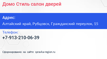 Домо Стиль, салон дверей по адресу Алтайский край, Рубцовск, Гражданский переулок, 15 в дальнейшем Организация, размещена в следующих категориях: