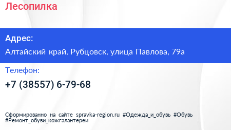 Лесопилка по адресу Алтайский край, Рубцовск, улица Павлова, 79а в дальнейшем Организация, размещена в следующих категориях: