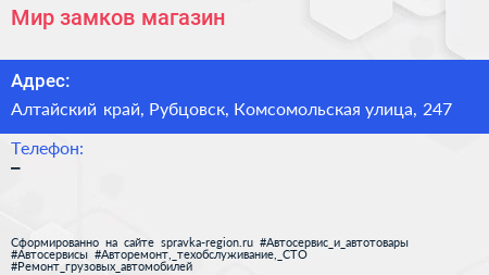 Мир замков, магазин по адресу Алтайский край, Рубцовск, Комсомольская улица, 247 в дальнейшем Организация, размещена в следующих категориях: