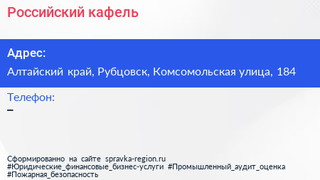 Российский кафель по адресу Алтайский край, Рубцовск, Комсомольская улица, 184 в дальнейшем Организация, размещена в следующих категориях: