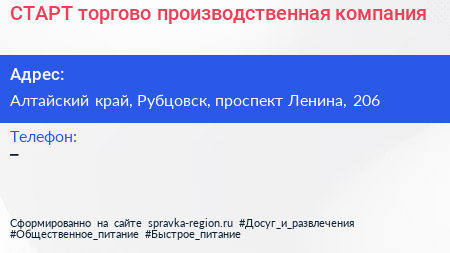 СТАРТ, торгово-производственная компания по адресу Алтайский край, Рубцовск, проспект Ленина, 206 в дальнейшем Организация, размещена в следующих категориях: