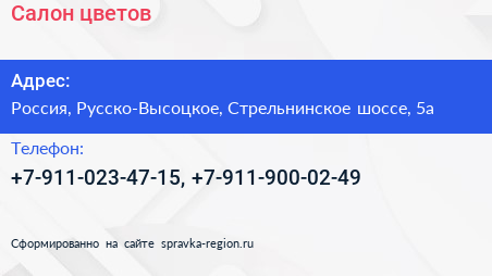 Салон цветов по адресу Пятёрочка, 5А, Стрельнинское шоссе, Ропша, Ропшинское сельское поселение, Ломоносовский район, Ленинградская область, Северо-Западный федеральный округ, Россия в дальнейшем Организация, размещена в следующих категориях: