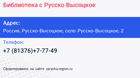 Библиотека, с. Русско-Высоцкое по адресу МФЦ «Мои документы», 2, Русско-Высоцкое, Русско-Высоцкое сельское поселение, Ломоносовский район, Ленинградская область, Северо-Западный федеральный округ, 188516, Россия в дальнейшем Организация, размещена в следующих категориях: