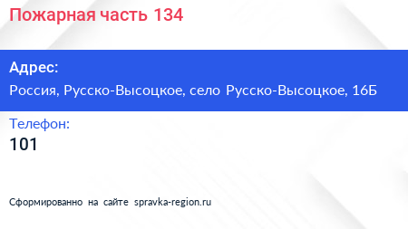 Пожарная часть №134 по адресу Пожарная часть № 134, 41К-631, Русско-Высоцкое, Русско-Высоцкое сельское поселение, Ломоносовский район, Ленинградская область, Северо-Западный федеральный округ, 188516, Россия в дальнейшем Организация, размещена в следующих категориях: