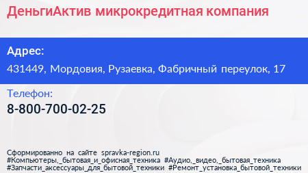 ДеньгиАктив, микрокредитная компания по адресу 431449, Мордовия, Рузаевка, Фабричный переулок, 17 в дальнейшем Организация, размещена в следующих категориях:
