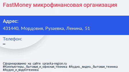 FastMoney, микрофинансовая организация по адресу 431440, Мордовия, Рузаевка, Ленина, 51 в дальнейшем Организация, размещена в следующих категориях: