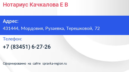 Нотариус Качкалова Е.В. по адресу 431444, Мордовия, Рузаевка, Терешковой, 72 в дальнейшем Организация, размещена в следующих категориях: